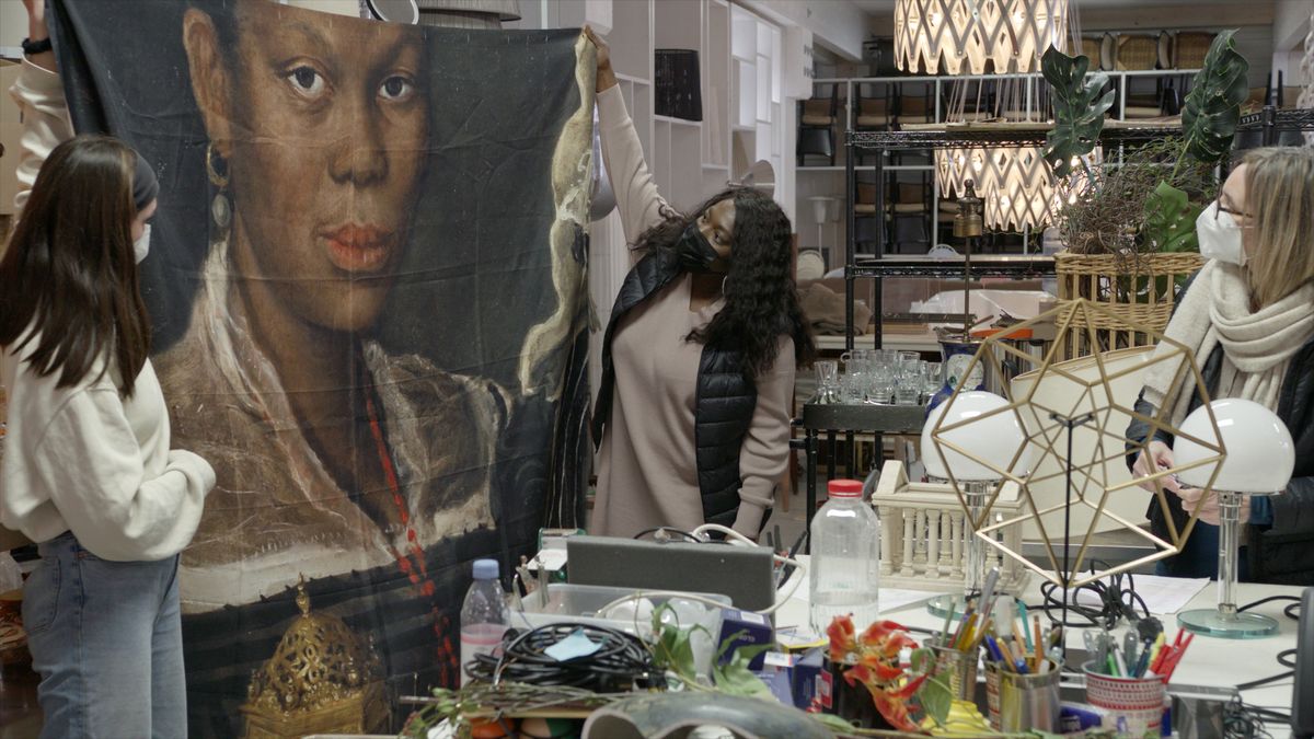 Gleichzeitig geht der Film der postkolonialen Geschichte der Dinge nach – verkörpert durch die BiPOC-Aktivistin Thelma Buabeng, die in die Rolle einer Doktorandin der Postcolonial Studies schlüpft, die im Fundus jobbt. Sie entdeckt einen parallelen Ding-Alltag von afrikanischen Objekten – koloniale Originale, Airport Art, rätselhafte oder rassistische Gegenstände und schließlich das Portrait einer „African Woman Holding a Clock“, das im Verlauf des Films in der Jetztzeit ankommt.